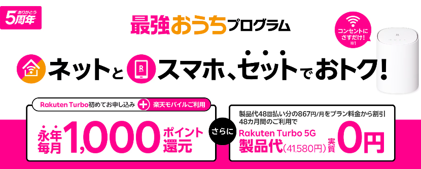 最強おうちプログラム | 楽天モバイルと Rakuten Turbo(ホームルーター) をセットで利用すると、毎月1,000ポイント還元(永年) 条件として両サービスを併用している必要あり |