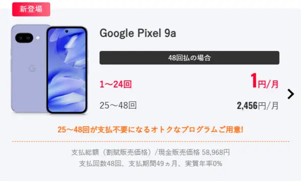 2年後の返却が不要な「買い切り」タイプです。ワイモバイルやUQモバイルが強力なキャンペーンを実施しています。