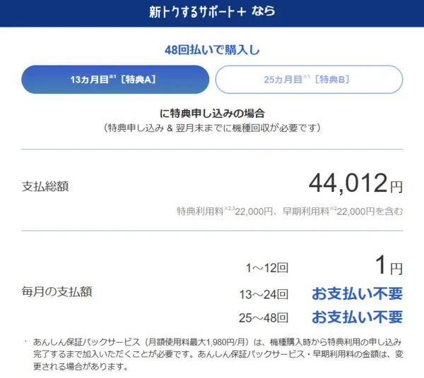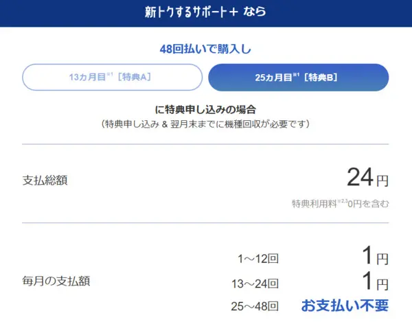 ただし、購入方法は「返却不要の一括1円」と「2年後に返却する実質1円」の2パターンに分かれています。