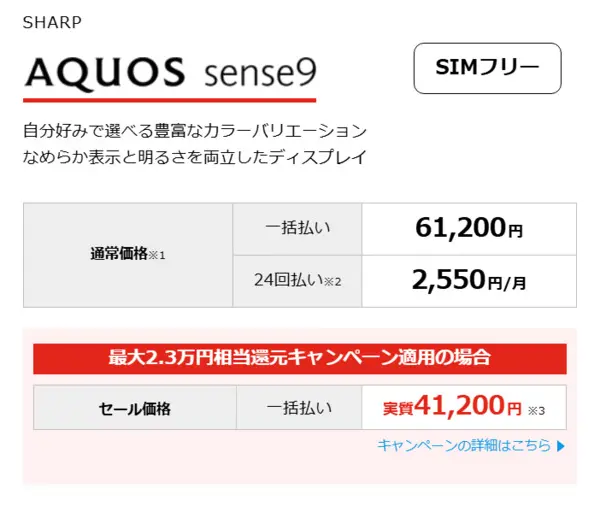 AQUOS sense9の本体価格は5万円台~6万円台、キャンペーン適用後価格は3万円台~4万円台です。