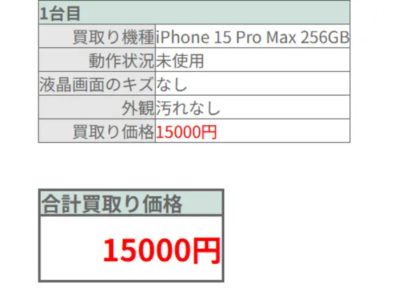 | iPhone高価買取のクイック | iPhone15 Pro Max(256GB):137,000円〜48,000円 |