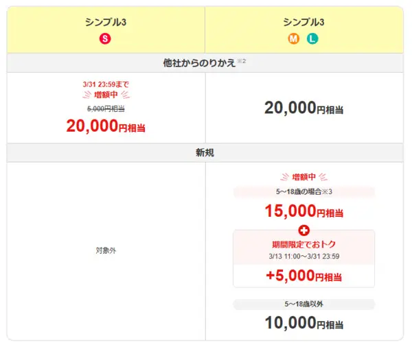 新規契約の場合はシンプル3 Sだと特典の対象外なのでご注意ください。