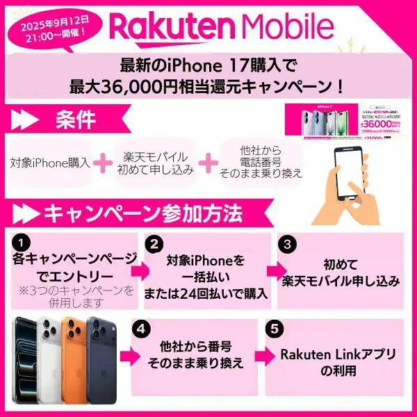 楽天モバイルより、「最新のiPhone 17購入で最大36,000円相当還元キャンペーン!」実施中!