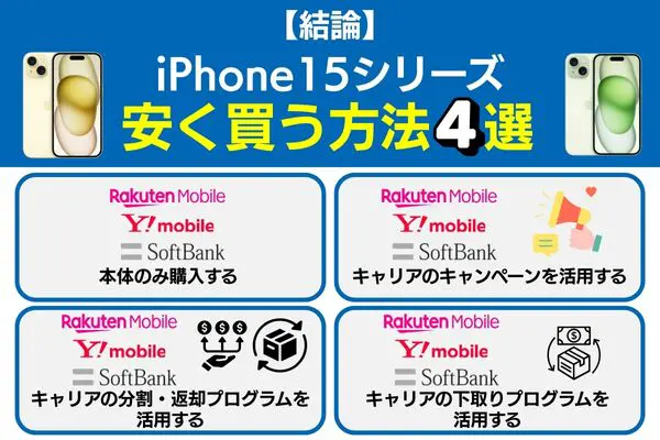 iPhone15シリーズを安く買う方法を、以下の4つに分けて解説します。