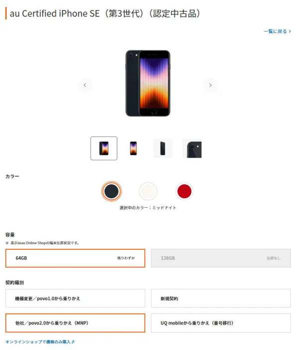 auでは、2026年3月現在、認定中古品として64GB・128GBのスターライトと(PRODUCT)REDに加え、ミッドナイトも64GBで在庫があります。