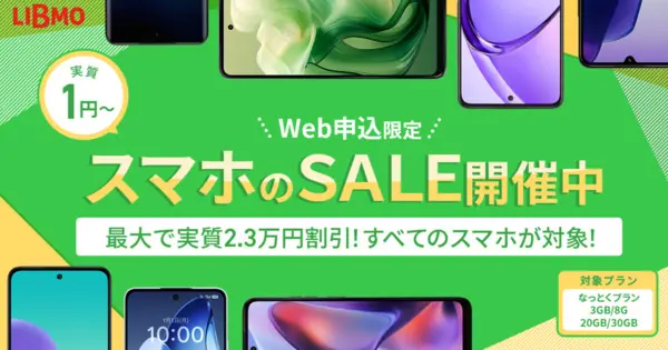スマホ大特価セール | 条件 音声通話機能付きSIMを新規(MNPを含む)契約 なっとくプランの3GB・8GB・20GB・30GBのいずれかの申込み 特典:LIBMOの取り扱いスマートフォンを特別価格で購入できる |