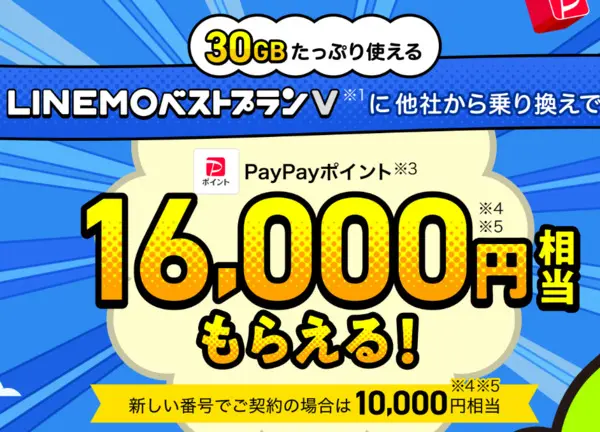| ヤフー携帯ショップ対象!PayPayポイント特典【LINEMOベストプランV】 | 新規またはMNPで「LINEMOベストプランV」に申し込みで最大16,000円相当のPayPayポイント付与。 |