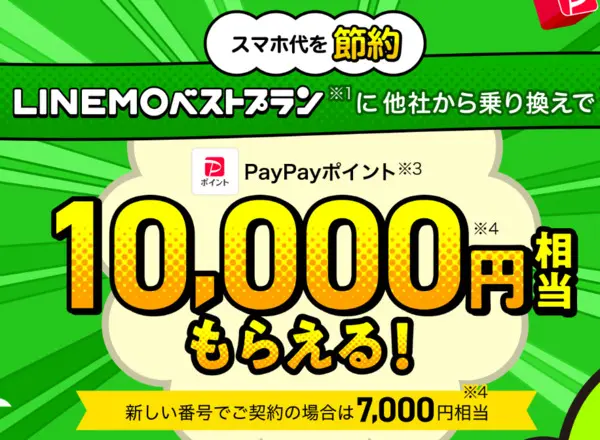 | LINEMOベストプラン紹介キャンペーン | MNPで乗り換えると、最大で10,000円相当のPayPayポイントプレゼント。 |