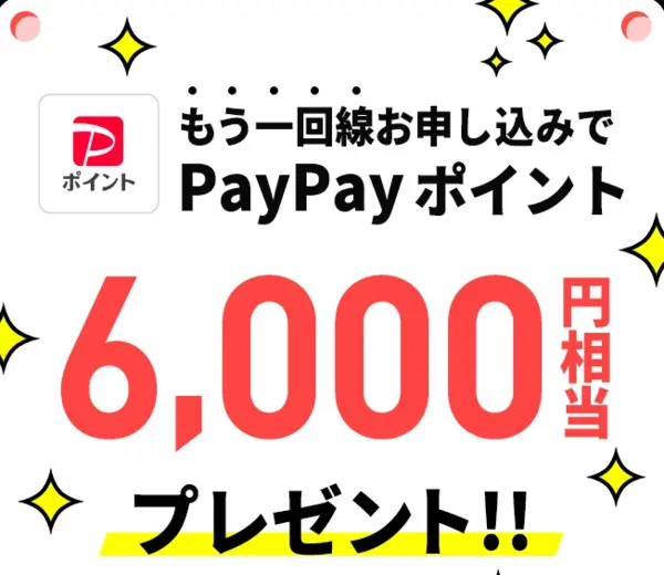 | 特典 | 最大12,000円相当のPayPayポイントプレゼント ※6回線×2,000円相当 |