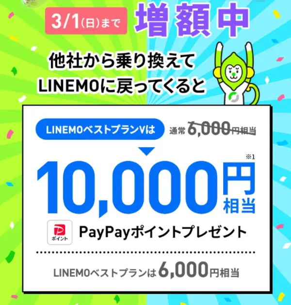PayPayポイントプレゼントキャンペーンLINEMOベストプラン、LINEMOベストプランVに他社から乗り換え、新しい番号で契約すると最大12,000円相当のPayPayポイントをプレゼント
