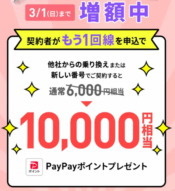 追加申込でPayPayポイント6,000円相当プレゼントキャンペーン※3月1日まで10,000円相当に増額中