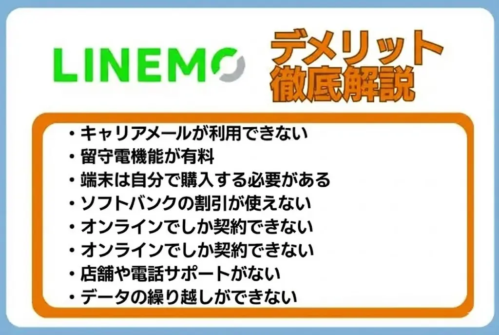 | LINEMOのデメリット | キャリアメールが使えない 留守電機能は有料 端末の販売がない 対面・電話サポートがない データの繰越不可 |