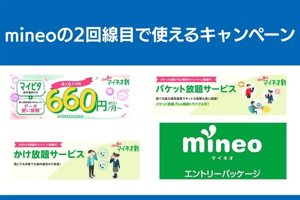 2026年2月現在、mineoの2回線目契約時に利用できるキャンペーンが複数あるので、お得に申し込むためにも、今回の記事を参考にしてくださいね。