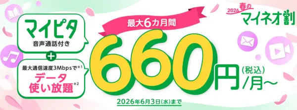 mineoでは期間限定で、「2026 春のマイネオ割」を実施しています。