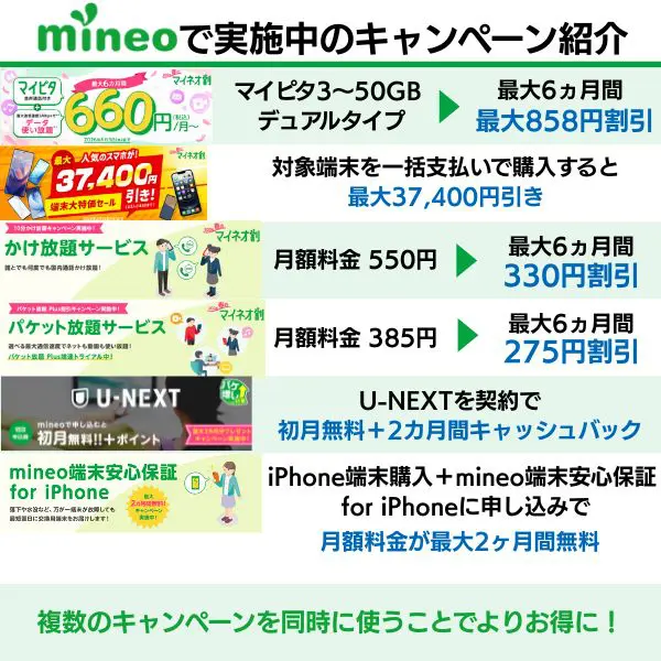 複数のキャンペーンを同時に使うことで、よりお得に、mineoの利用をはじめられるため、各キャンペーンの詳細について詳しくみていきましょう。