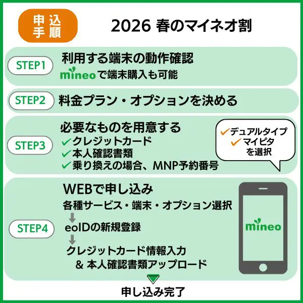 「2026 春のマイネオ割」に申し込む流れは以下のとおりです。
