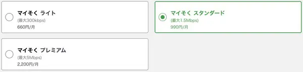 【デュアルタイプ/シングルタイプ共通】 プレミアム(最大通信速度5Mbps):2,200円/月 スタンダード(最大通信速度1.5Mbps):990円/月 ライト(最大通信速度300kbps):660円/月 ※マイそく スーパーライトでの申し込みは、本キャンペーンの適用対象外です |