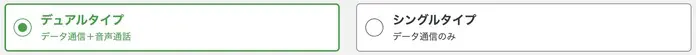 タイプ | デュアルタイプ(音声通話+データ通信) シングルタイプ(データ通信のみ) ※データ通信のみのタイプの場合、SMSの利用要否は選択可能です |