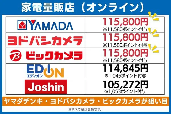 | ポイントを貯めたい | 家電量販店(ヨドバシ・ビック・ヤマダ) | 実質104,220円 |