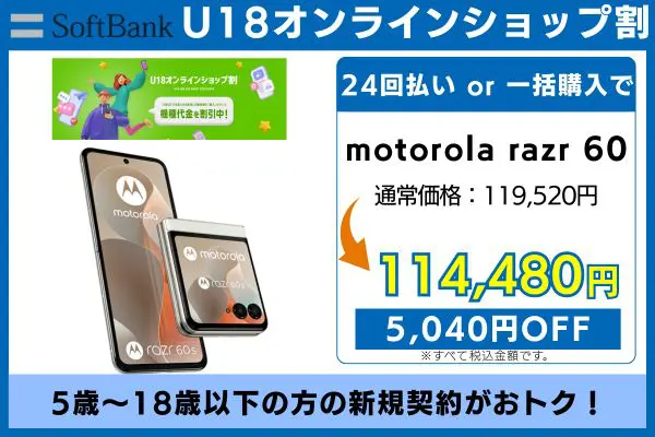 ソフトバンクでは、「新トクするサポート+」を適用することで、motorola razr 60を実質12円(税込)〜で購入できます。