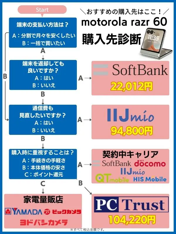 保証を重視するならモトローラ公式、ポイントを貯めたい人は家電量販店をチェックしましょう。