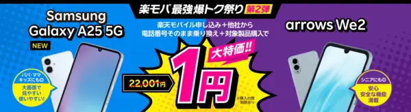 arrows We2を楽天モバイルで購入する際、Samsung Galaxy A25 5G、OPPO A3 5Gと同じキャンペーンを利用すると、1円(税込)で購入できます。