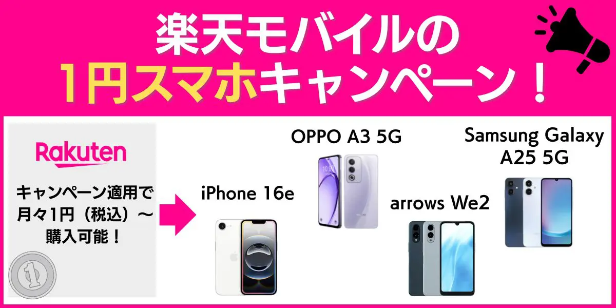 楽天モバイル利用中やこれから楽天モバイルを契約されるなどで、1円でスマホを購入したいと考えている方もいるでしょう。