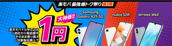 | 楽天モバイル申し込み+他社から電話番号そのまま乗り換え+対象製品購入で1円! | |