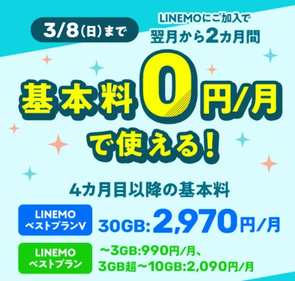 LINEMOでは、期間限定の「週穫祭キャンペーン」として、基本料が2カ月間無料になる特典を実施しています。