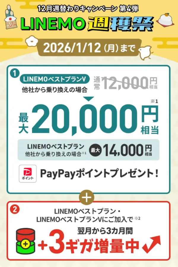 LINEMOでは現在、新しい電話番号での契約または他社からの乗り換え(MNP)で「LINEMO ベストプラン」または「LINEMO ベストプランV」を契約すると、最大12,000円相当のPayPayポイントがもらえるお得なキャンペーンを実施中です。