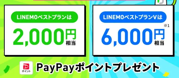 | 特典 | 「LINEMOベストプランV」の場合:PayPayポイント6,000円相当プレゼント 「LINEMOベストプラン」の場合:PayPayポイント2,000円相当プレゼント ※PayPay公式ストア等でも利用可能 ※出金・譲渡不可 |