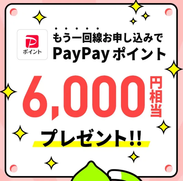 すでにLINEMOを契約している方がLINEMO公式サイトの特設ページから同一名義で新規契約、または他社回線からの乗り換えで回線を追加すると、PayPayポイント6,000円分をもらえるキャンペーンになります。
