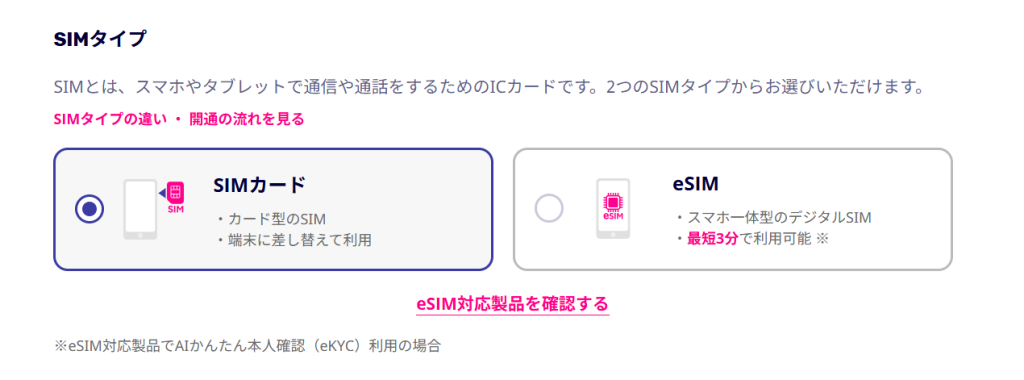 eSIMを選択すればオンラインで即日開通が可能で、物理SIMの場合は数日で配送されます。