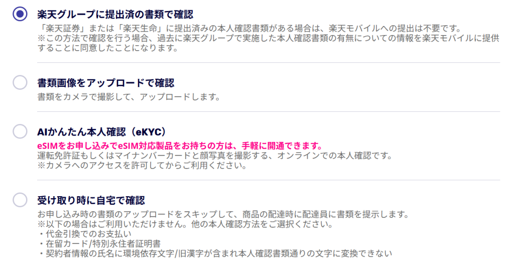 - 配達時に提示:SIM受け取り時に書類提示する方法。