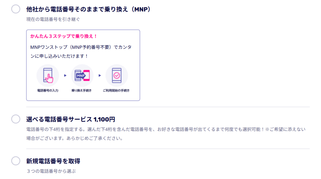 次に、「他社から乗り換え(MNP)」または「新規電話番号の取得」から自分の契約形態を選びましょう。