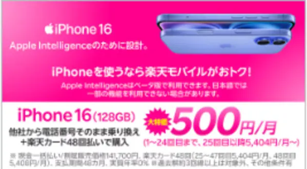 - iPhone 16(128GB)がおトク!他社から電話番号そのまま乗り換え+楽天カード48回払いで500円/月~!