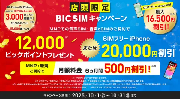 - BIC SIM|店頭限定最大12,000ポイントキャッシュバック