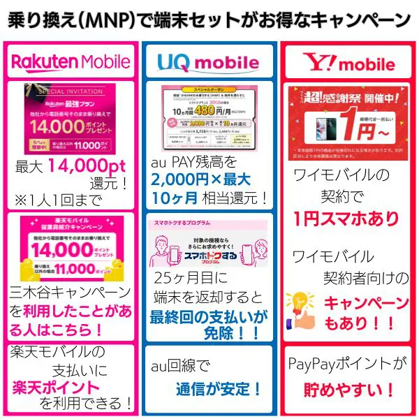 - 楽天モバイル・ワイモバイル・UQモバイルはiPhoneやAndroid機種との端末セットキャンペーンあり
