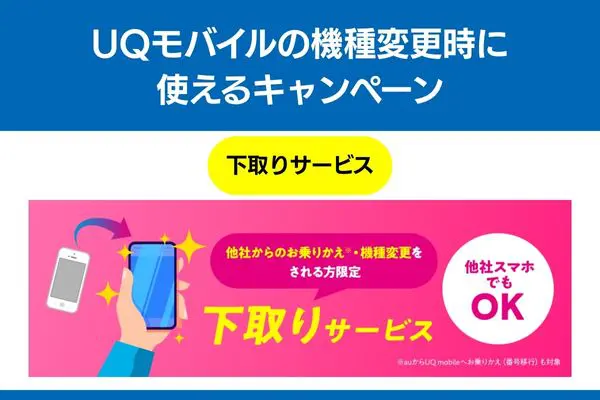 今お使いの機種をUQモバイルに下取りに出すと、下取り対象機種に応じてポイントがもらえるサービスです。