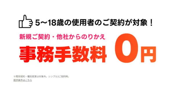 | 【U18限定】事務手数料無料キャンペーン | 使用者が5歳以上18歳以下の場合、ワイモバイルオンラインストアでシンプル3に申し込むと契約事務手数料無料 |