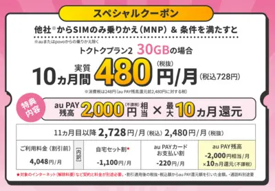サイト限定で他社から乗り換え(MNP)&条件を満たすと、2,000円相当×10ヶ月でau PAY残高還元(不課税)されることにより、30GBトクトクプラン2が10ヶ月間実質480円(税抜)でご利用可能です!(※1)