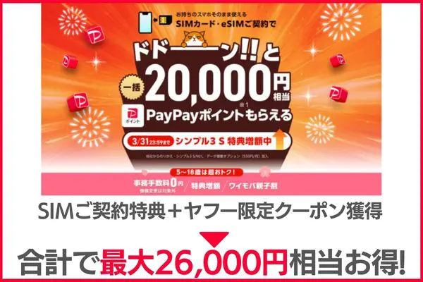 ![]() ワイモバ SIM契約キャンペーン4 | 【MNP•新規契約におすすめ】 最大20,000円相当のPayPayポイントコードがもらえる シンプル3 S/M/Lに申し込み、開通する |