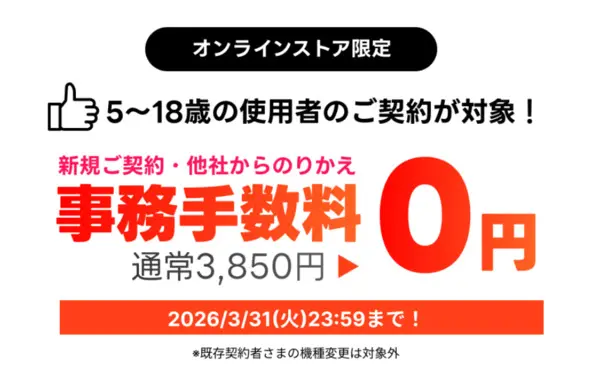 5~18歳の方を対象に、ワイモバイルの契約事務手数料が無料になるお得なキャンペーンを実施中です。