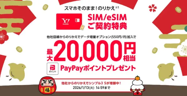 ![]() ワイモバ SIM契約キャンペーン4 | 【MNP•新規契約におすすめ】 最大20,000円相当のPayPayポイントコードがもらえる シンプル3 S/M/Lに申し込み、開通する |
