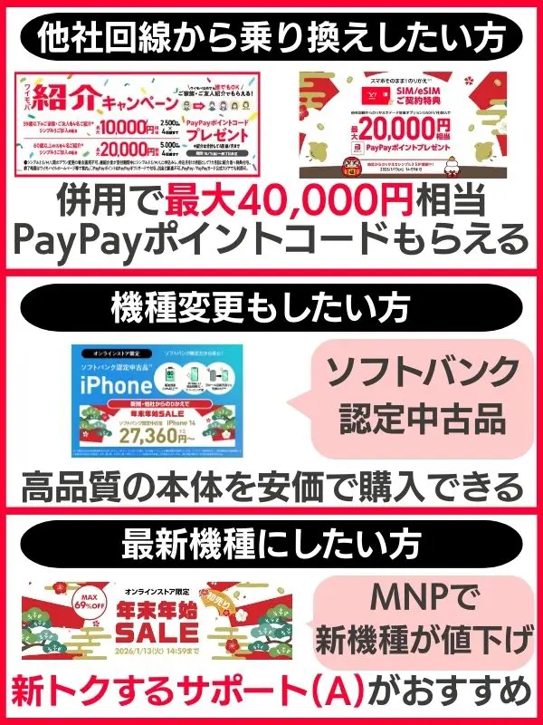 ![]() ワイモバイル紹介キャンペーン | 【MNP•新規契約におすすめ】 最大20,000円相当のPayPayポイントコードがもらえる シンプル3 S/M/Lに申し込み、開通する |