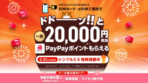 ![]() SIMご契約特典 | 申し込み日の翌々月にPayPayポイント最大20,000円相当プレゼント ※20,000円ポイント獲得するには、他社からの乗り換えかつ、シンプル3 M/L・データ増量オプションの加入が必要 ※3月31日までの期間限定で他社から乗り換え・シンプル3 Sでも20,000円相当に増額中! |