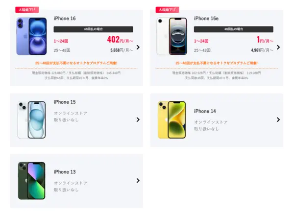 最新ではなく一つ前(現在ならiPhone 16)のiPhoneなどのラインナップはあります。