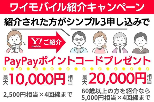 家族でお互いを紹介し合い、契約の時に「ワイモバSIM契約キャンペーン4」をあわせて利用することで、それぞれ最大20,000円相当のPayPayポイントコードがもらえます。