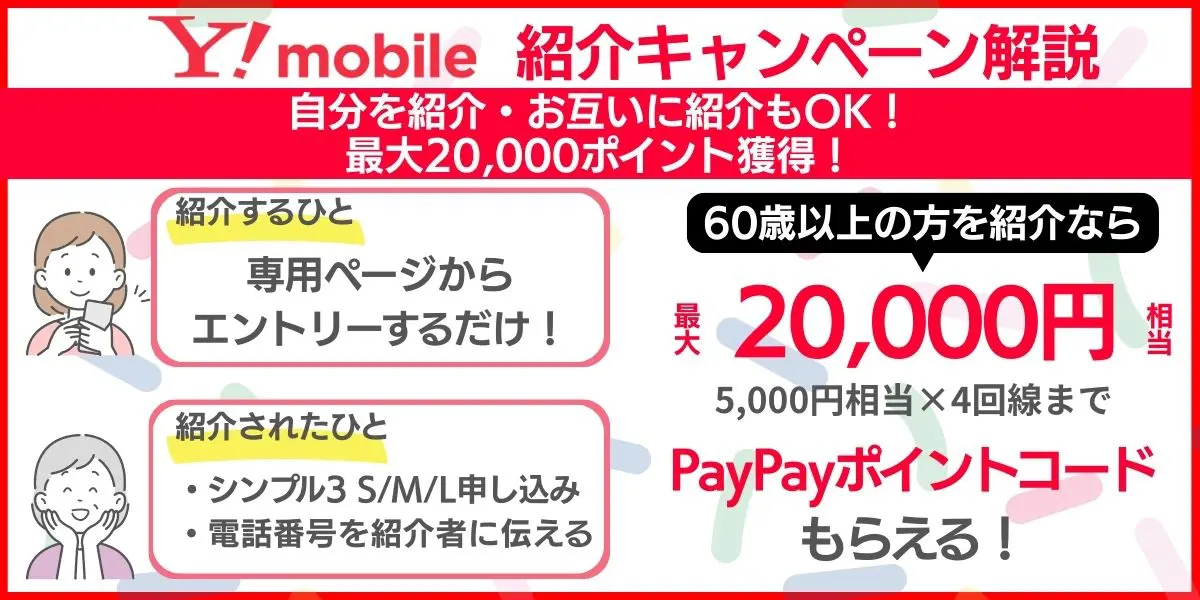 本記事では、ロケホン編集部で調査した紹介されたひとがワイモバイルを契約する場合に20,000円相当のポイントがもらえる方法と、自分で自分を紹介して特典をもらう方法もあわせて解説します。