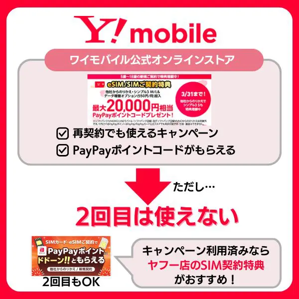 過去『最大20,000円相当もらえるワイモバキャンペーン』を利用した場合、再契約では使えない